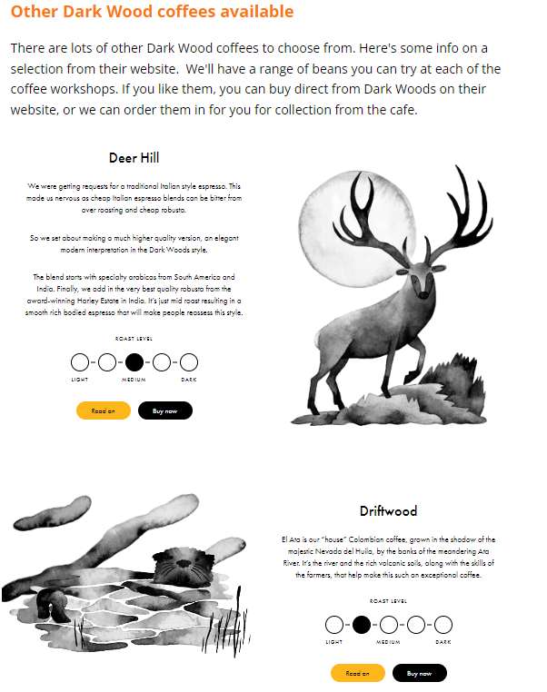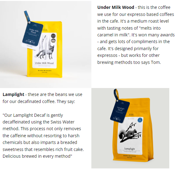 When we first opened, the decision about which coffee we would use was a big one. We went with Dark Woods. Their award winning coffee tastes amazing (it's stocked in Harrods & other posh places), they are reasonably local (outside Huddersfield) and they make big efforts to be ethical.