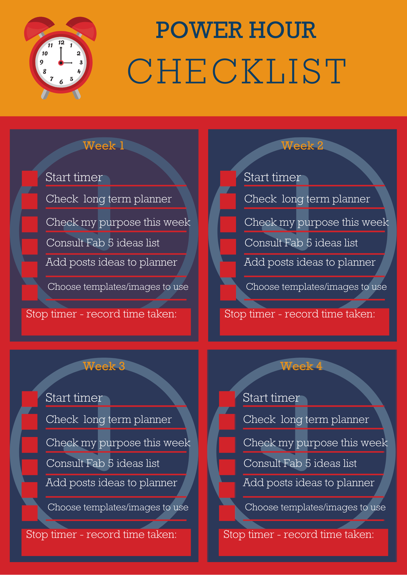 This week I am introducing the ‘power hour process’ as a helpful approach. It is designed to speed up the time it takes you to get a weeks worth of social media posts planned and ready to go for your business. As mentioned in the Week 3 video and handout, I’ve got two templates to share with you below. Use the week planner to sketch out your ‘ideal’ week of posts: use this each week to jot down what you want to post about. Use the power hour checklist to help you motor through those social media prep tasks in record time each week. Log your time - and aim to improve each week.